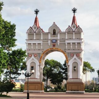 Путешественник, впервые оказавшийся в Благовещенске, обычно замечает эту арку почти мгновенно. Она выглядит нарядно и парадно, но не холодно; в ней есть не музейная отстранённость, а живая городская энергия. Это не просто декоративный объект на площади, а сооружение, которое воспринимается как вход в историческое пространство города. Не случайно официальный туристический контур Благовещенска выводит Триумфальную арку в число ключевых достопримечательностей, а также называет её самой высокой из четырёх подобных арок на Дальнем Востоке.